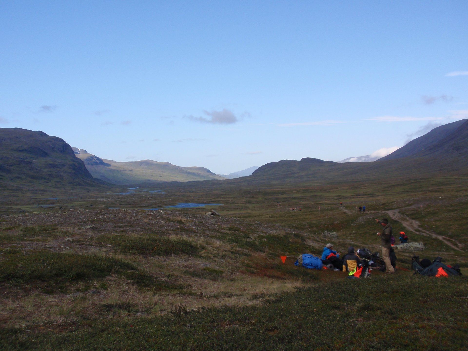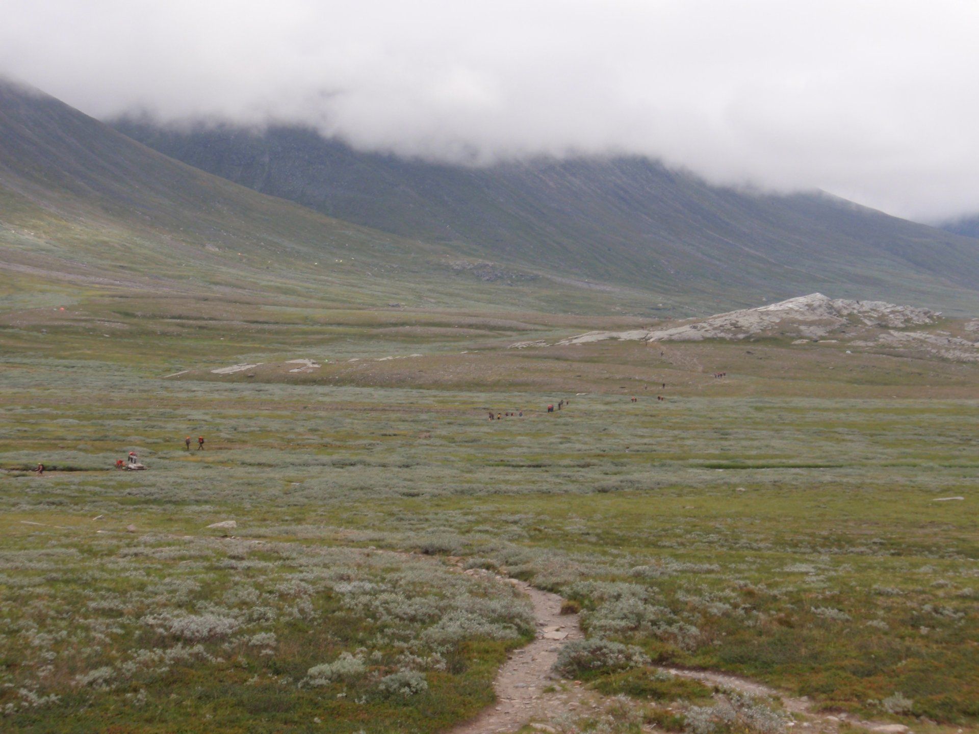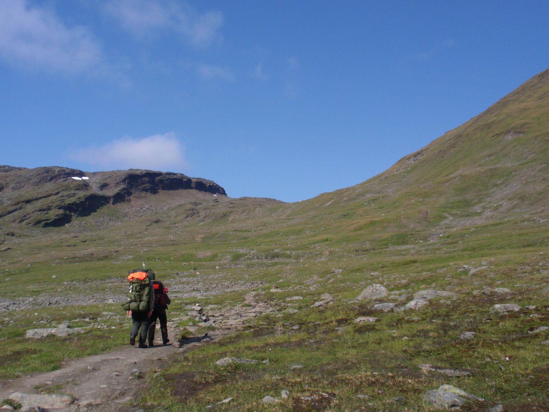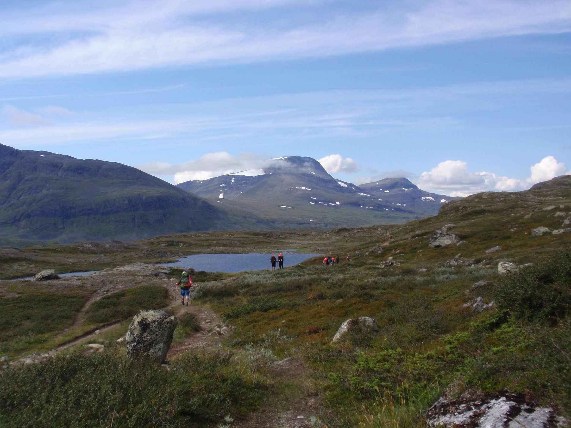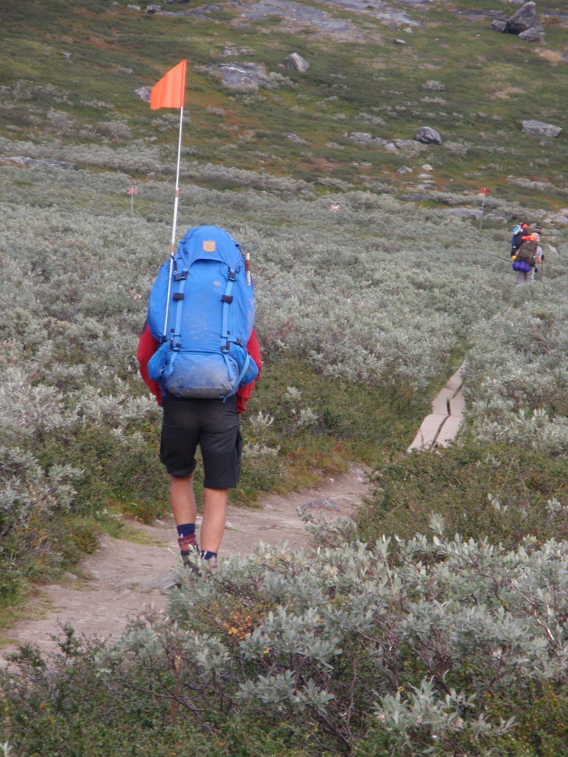 We lopen westelijk, eerst door een berkenbos, waarbij de berken door de noordelijke ligging niet hoger zijn als een meter of 3. Mijn rugzak voelt wat onwennig en mijn voeten doen nu al zeer, maar wat geniet ik van deze overweldigende natuur. Geen wegen, dus geen auto's, alleen maar een lange rij wandelaars met een rugzak op hun rug, met daaraan een oranje tag, zodat je in noodgevallen zichtbaar bent vanuit de lucht. Geen lucht-, licht- of geluid vervuiling, puur natuur! De paden zijn goed begaanbaar en we genieten van de stilte. Na zo'n 6 km komen we bij een prachtig meer, waar zich een 'Lapdonalds' bevindt, waar we een heerlijke wrap met rendiervlees bestellen. Even pauze, de rugzak af en de voetjes even rust geven. Inmiddels is het lint met wandelaars behoorlijk uit elkaar getrokken en krijgen we steeds meer het gevoel dat we alleen op de wereld zijn. Na een half uur hangen we de rugzakken weer om en lopen we verder langs het meer. Na het meer wandelen we langzaam omhoog het berkenbos uit en komen na nog zo'n 12 km in Kebnekaise, onze laatste stop in de nog relatief bewoonde wereld. Hier in het fjällstation (berghut) is nog stromend water en gewone toiletten. Het is inmiddels etenstijd en we besluiten hier onze eerste expeditie maaltijd te maken en na het eten nog een kilometer of 3 door te lopen, alvorens we ons kampement maken. Bizar hoe zo'n expeditie maaltijd na 18,82 km wandelen smaakt. We slaan voldoende water in om de avond en nacht door te komen, hierdoor hoeven we niet perse bij een rivier te kamperen. Inmiddels laten we de boomgrens achter ons en wandelen we door relatief smal dal met links en rechts van ons bergen. Voor ons loopt het kronkelend pad steeds meer omhoog en zien we een lang lint wandelaars met oranje tags aan hun rugzakken. We wandelen door tot een uur of 8 's avonds. Ik ben ieder gevoel voor tijd inmiddels kwijt omdat in deze tijd van het jaar de zon bijna niet meer onder gaat, zo'n 100 km boven de Poolcirkel. Alleen de vermoeidheid in mijn lichaam en de pijn aan mijn voeten maken mij duidelijk dat het genoeg is geweest voor vandaag. gedeeltelijk over het Kungsleden Trail, door een drassig gebied, waardoor gebruik wordt gemaakt van plankenpaden. Een prachtig heuvelachtig gebied met veel bosbessenstruiken en rivieren waar je nog gewoon uit kunt drinken.