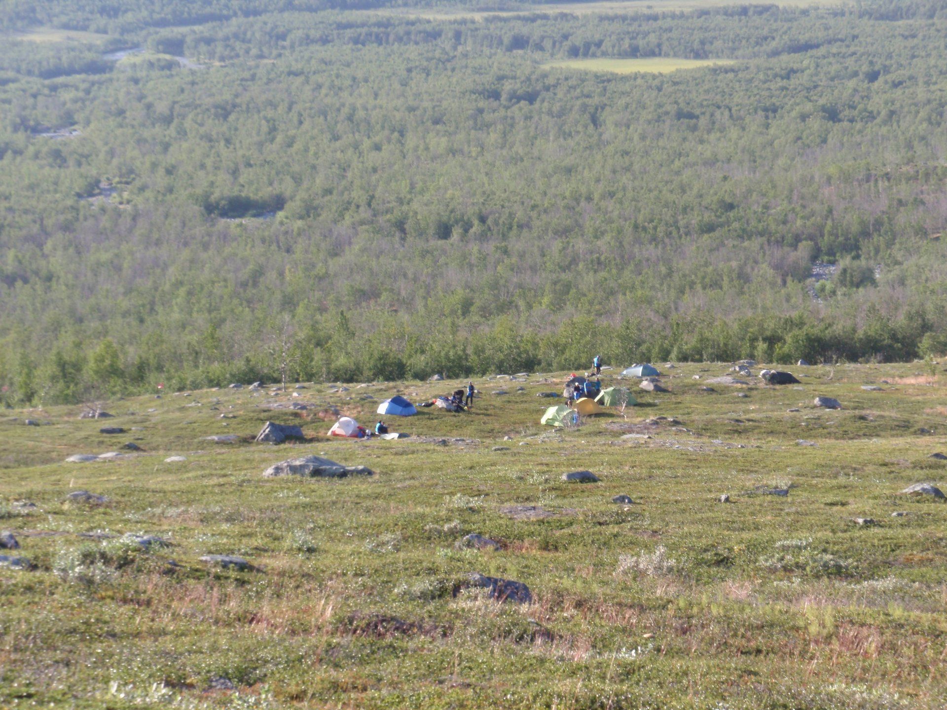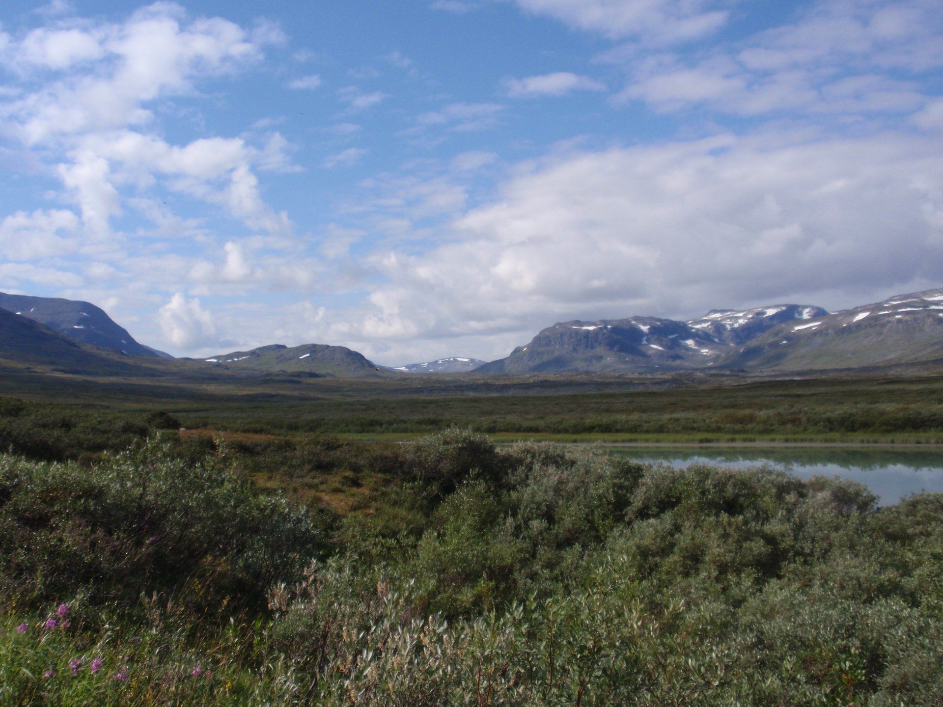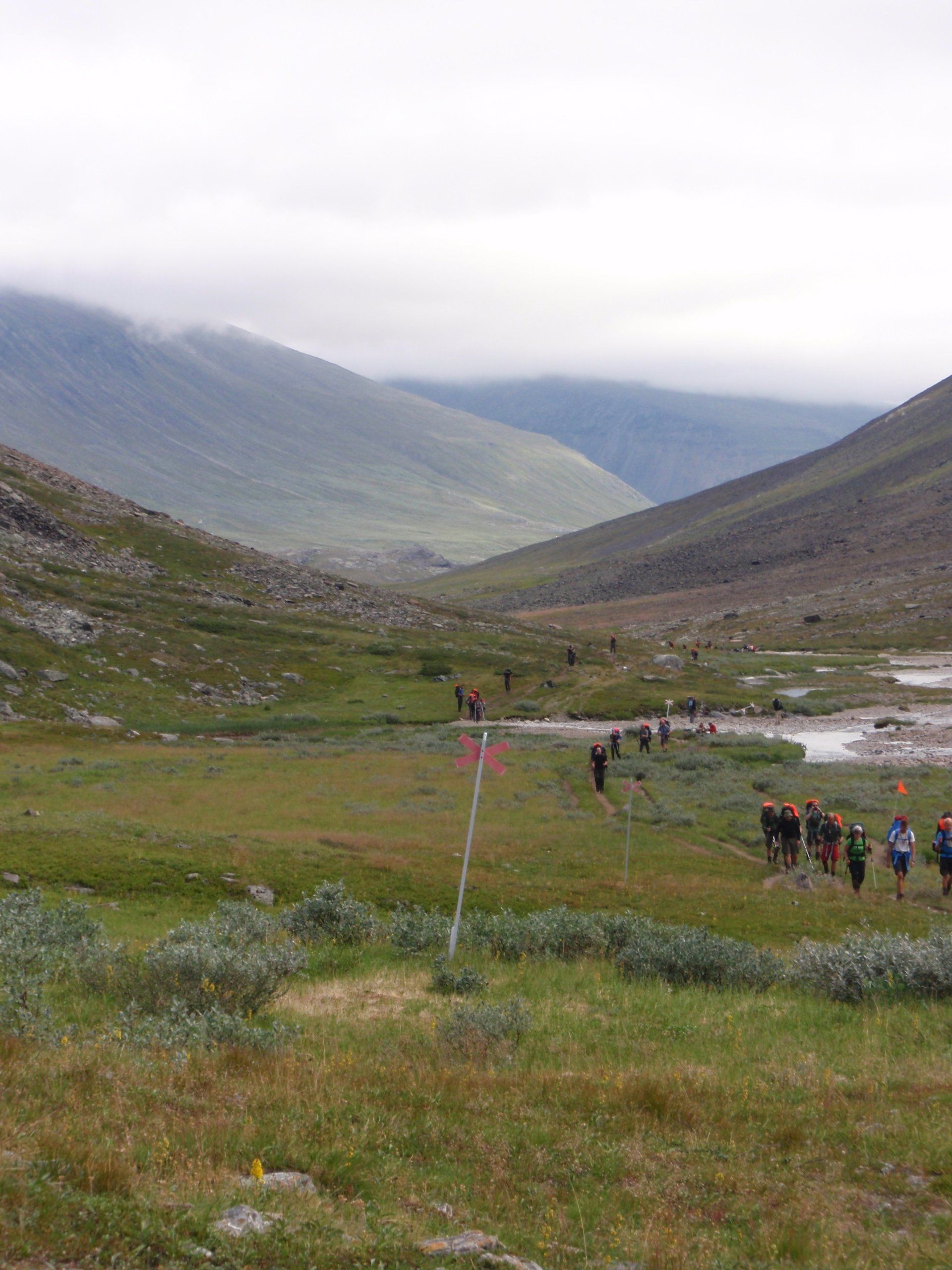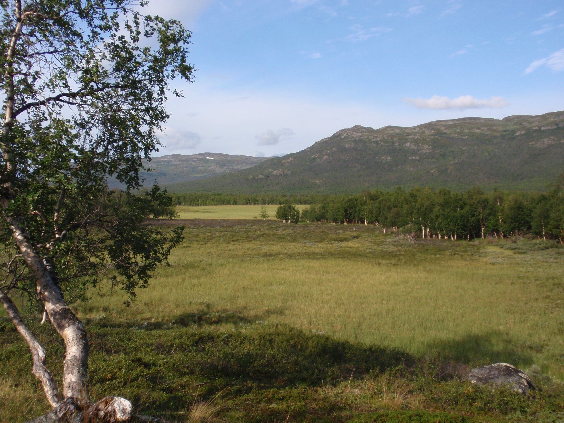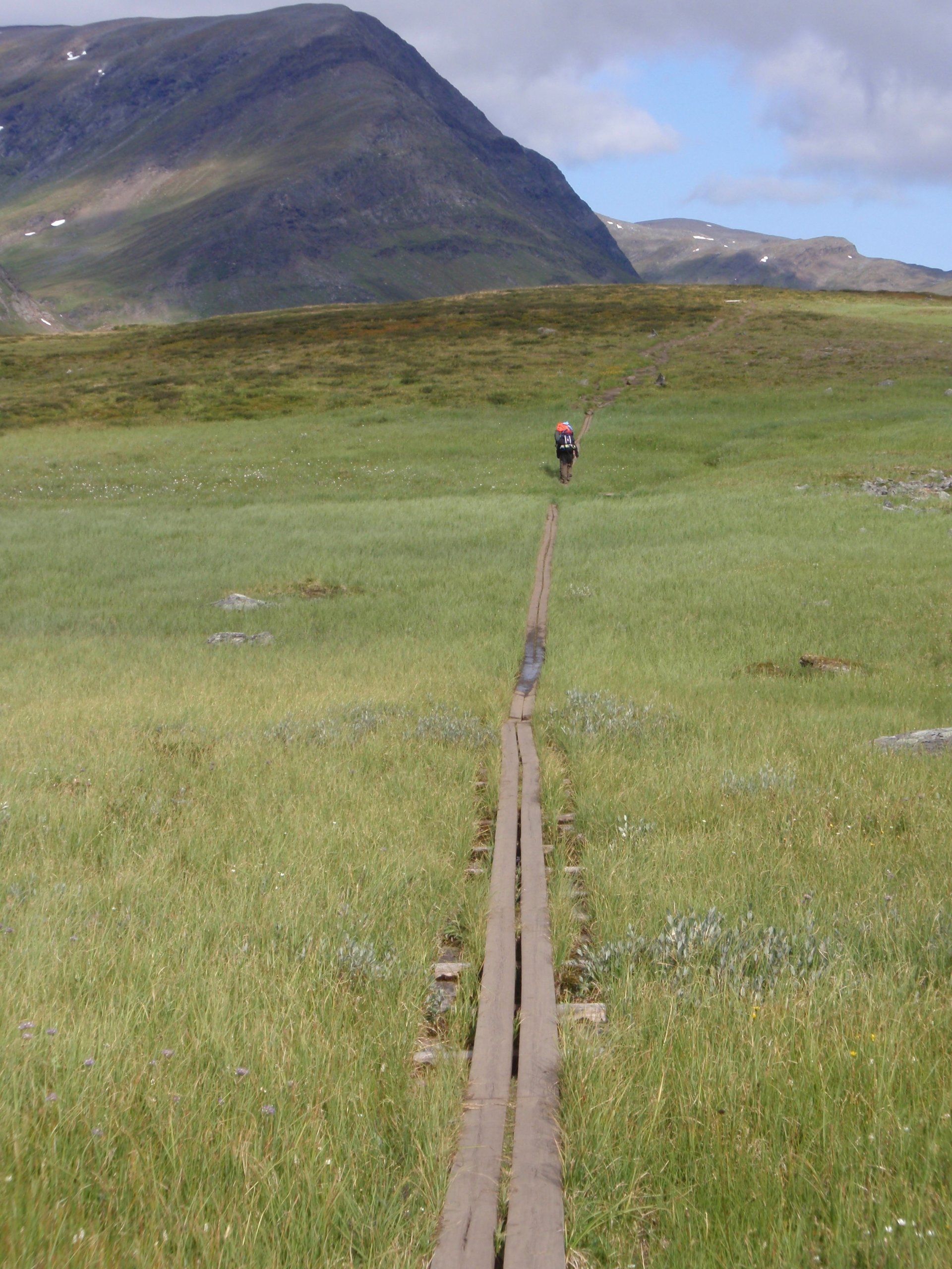 We lopen westelijk, eerst door een berkenbos, waarbij de berken door de noordelijke ligging niet hoger zijn als een meter of 3. Mijn rugzak voelt wat onwennig en mijn voeten doen nu al zeer, maar wat geniet ik van deze overweldigende natuur. Geen wegen, dus geen auto's, alleen maar een lange rij wandelaars met een rugzak op hun rug, met daaraan een oranje tag, zodat je in noodgevallen zichtbaar bent vanuit de lucht. Geen lucht-, licht- of geluid vervuiling, puur natuur! De paden zijn goed begaanbaar en we genieten van de stilte. Na zo'n 6 km komen we bij een prachtig meer, waar zich een 'Lapdonalds' bevindt, waar we een heerlijke wrap met rendiervlees bestellen. Even pauze, de rugzak af en de voetjes even rust geven. Inmiddels is het lint met wandelaars behoorlijk uit elkaar getrokken en krijgen we steeds meer het gevoel dat we alleen op de wereld zijn. Na een half uur hangen we de rugzakken weer om en lopen we verder langs het meer. Na het meer wandelen we langzaam omhoog het berkenbos uit en komen na nog zo'n 12 km in Kebnekaise, onze laatste stop in de nog relatief bewoonde wereld. Hier in het fjällstation (berghut) is nog stromend water en gewone toiletten. Het is inmiddels etenstijd en we besluiten hier onze eerste expeditie maaltijd te maken en na het eten nog een kilometer of 3 door te lopen, alvorens we ons kampement maken. Bizar hoe zo'n expeditie maaltijd na 18,82 km wandelen smaakt. We slaan voldoende water in om de avond en nacht door te komen, hierdoor hoeven we niet perse bij een rivier te kamperen. Inmiddels laten we de boomgrens achter ons en wandelen we door relatief smal dal met links en rechts van ons bergen. Voor ons loopt het kronkelend pad steeds meer omhoog en zien we een lang lint wandelaars met oranje tags aan hun rugzakken. We wandelen door tot een uur of 8 's avonds. Ik ben ieder gevoel voor tijd inmiddels kwijt omdat in deze tijd van het jaar de zon bijna niet meer onder gaat, zo'n 100 km boven de Poolcirkel. Alleen de vermoeidheid in mijn lichaam en de pijn aan mijn voeten maken mij duidelijk dat het genoeg is geweest voor vandaag. gedeeltelijk over het Kungsleden Trail, door een drassig gebied, waardoor gebruik wordt gemaakt van plankenpaden. Een prachtig heuvelachtig gebied met veel bosbessenstruiken en rivieren waar je nog gewoon uit kunt drinken.