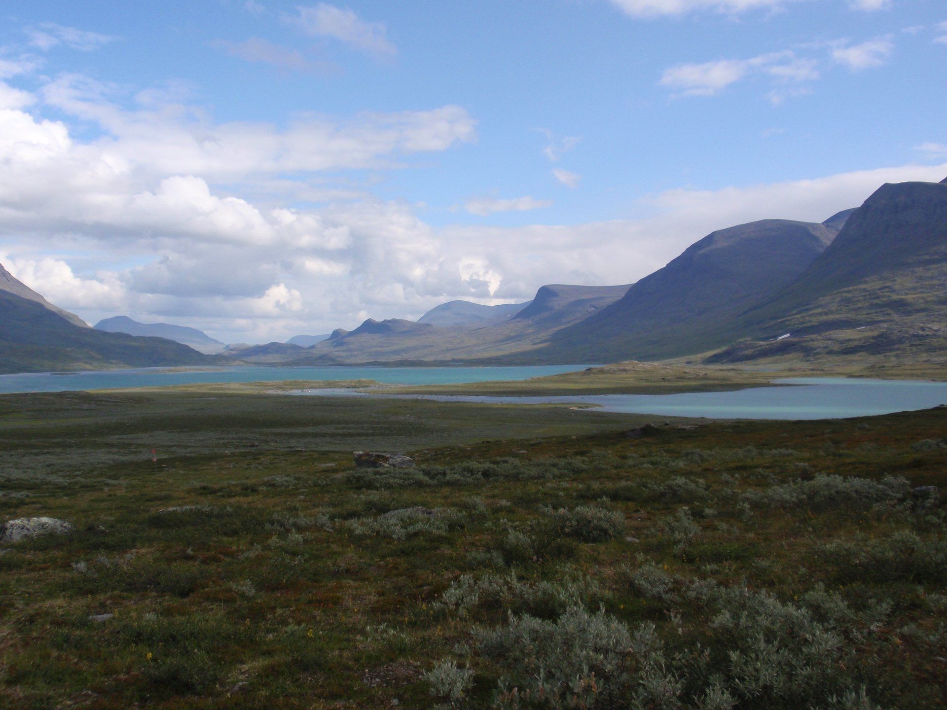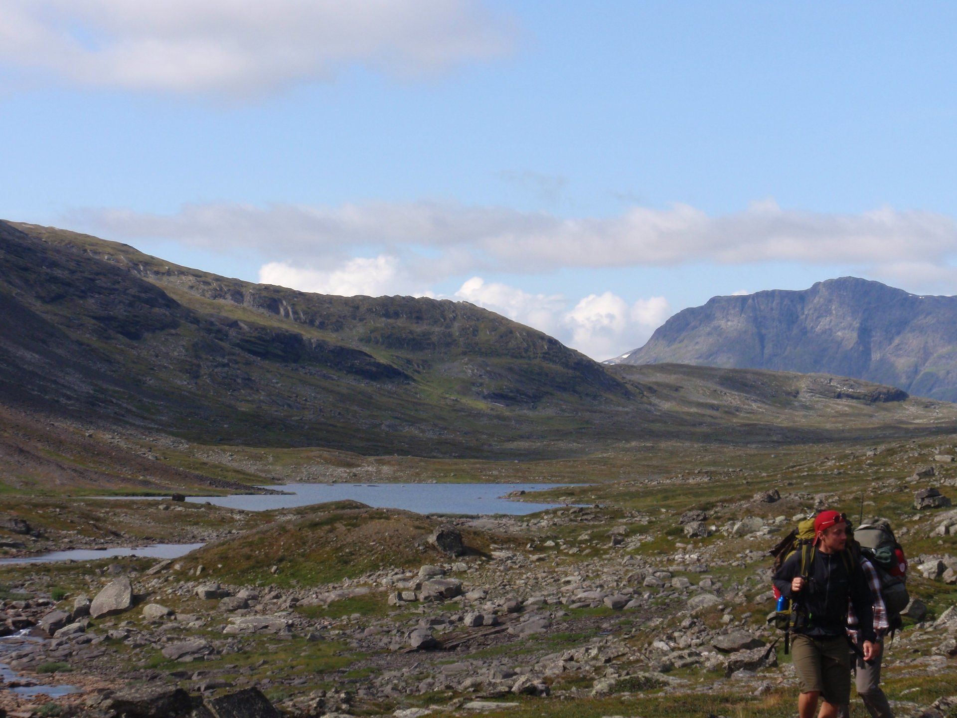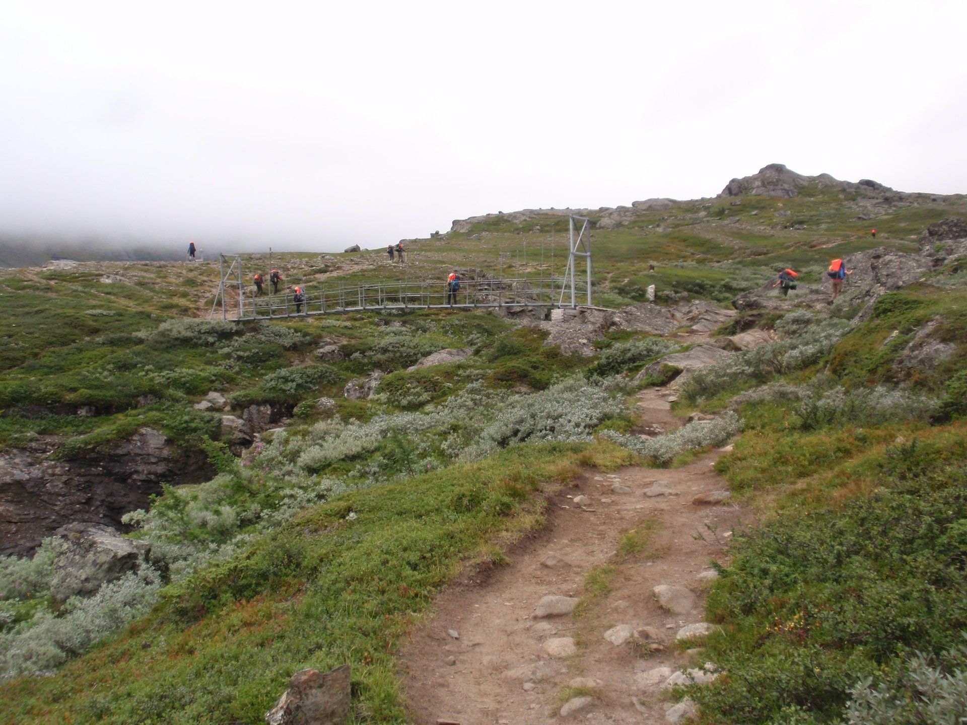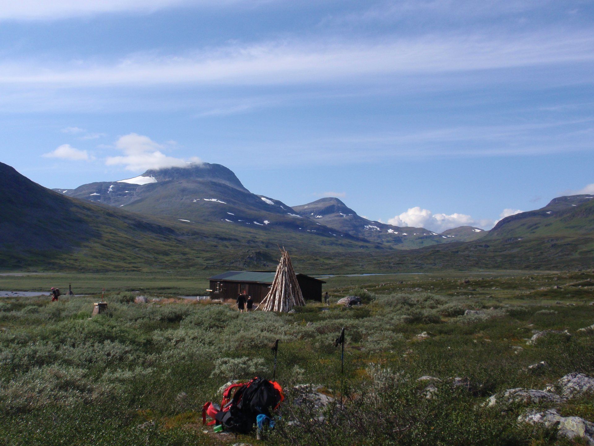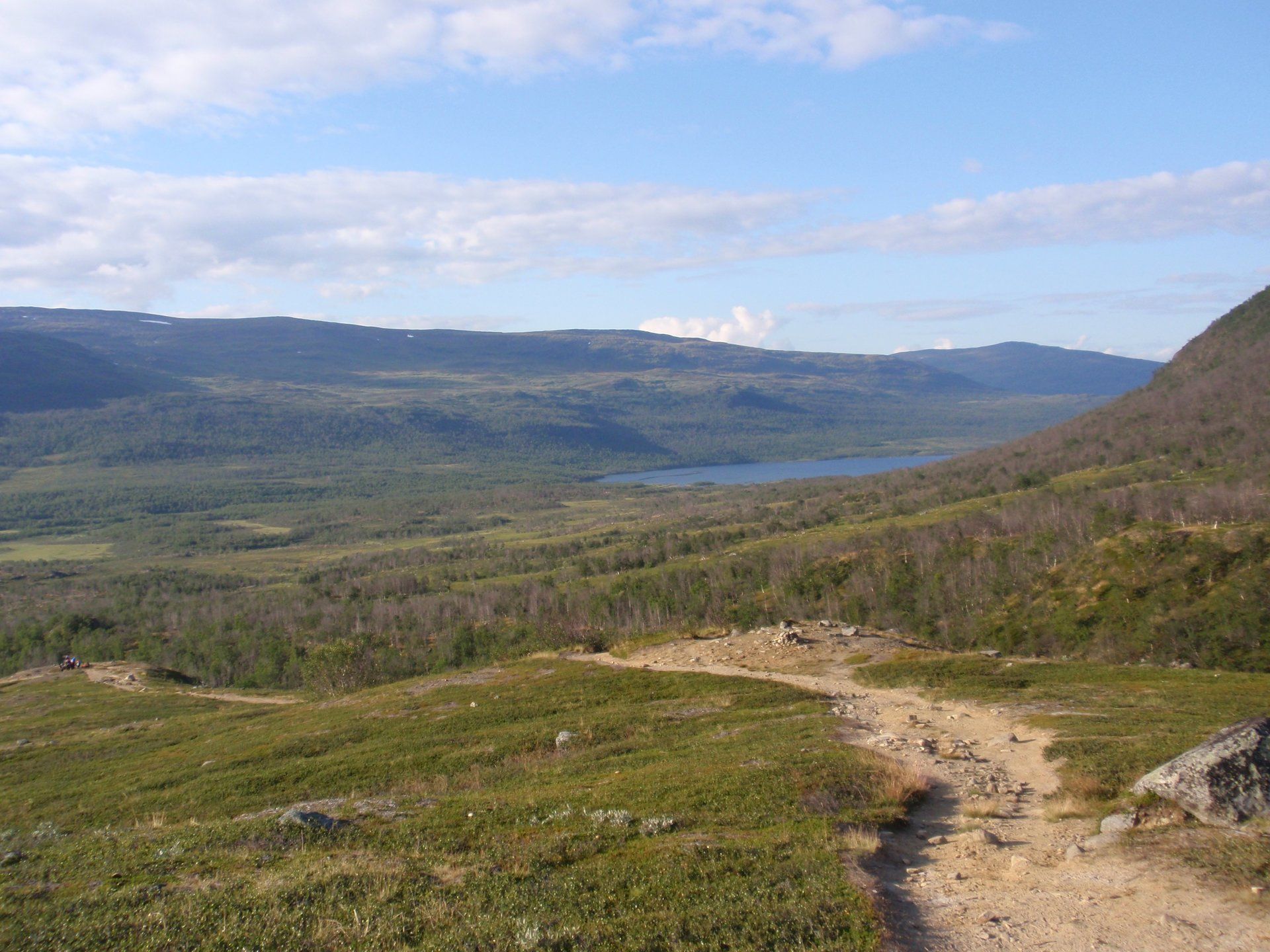 We lopen westelijk, eerst door een berkenbos, waarbij de berken door de noordelijke ligging niet hoger zijn als een meter of 3. Mijn rugzak voelt wat onwennig en mijn voeten doen nu al zeer, maar wat geniet ik van deze overweldigende natuur. Geen wegen, dus geen auto's, alleen maar een lange rij wandelaars met een rugzak op hun rug, met daaraan een oranje tag, zodat je in noodgevallen zichtbaar bent vanuit de lucht. Geen lucht-, licht- of geluid vervuiling, puur natuur! De paden zijn goed begaanbaar en we genieten van de stilte. Na zo'n 6 km komen we bij een prachtig meer, waar zich een 'Lapdonalds' bevindt, waar we een heerlijke wrap met rendiervlees bestellen. Even pauze, de rugzak af en de voetjes even rust geven. Inmiddels is het lint met wandelaars behoorlijk uit elkaar getrokken en krijgen we steeds meer het gevoel dat we alleen op de wereld zijn. Na een half uur hangen we de rugzakken weer om en lopen we verder langs het meer. Na het meer wandelen we langzaam omhoog het berkenbos uit en komen na nog zo'n 12 km in Kebnekaise, onze laatste stop in de nog relatief bewoonde wereld. Hier in het fjällstation (berghut) is nog stromend water en gewone toiletten. Het is inmiddels etenstijd en we besluiten hier onze eerste expeditie maaltijd te maken en na het eten nog een kilometer of 3 door te lopen, alvorens we ons kampement maken. Bizar hoe zo'n expeditie maaltijd na 18,82 km wandelen smaakt. We slaan voldoende water in om de avond en nacht door te komen, hierdoor hoeven we niet perse bij een rivier te kamperen. Inmiddels laten we de boomgrens achter ons en wandelen we door relatief smal dal met links en rechts van ons bergen. Voor ons loopt het kronkelend pad steeds meer omhoog en zien we een lang lint wandelaars met oranje tags aan hun rugzakken. We wandelen door tot een uur of 8 's avonds. Ik ben ieder gevoel voor tijd inmiddels kwijt omdat in deze tijd van het jaar de zon bijna niet meer onder gaat, zo'n 100 km boven de Poolcirkel. Alleen de vermoeidheid in mijn lichaam en de pijn aan mijn voeten maken mij duidelijk dat het genoeg is geweest voor vandaag. gedeeltelijk over het Kungsleden Trail, door een drassig gebied, waardoor gebruik wordt gemaakt van plankenpaden. Een prachtig heuvelachtig gebied met veel bosbessenstruiken en rivieren waar je nog gewoon uit kunt drinken.