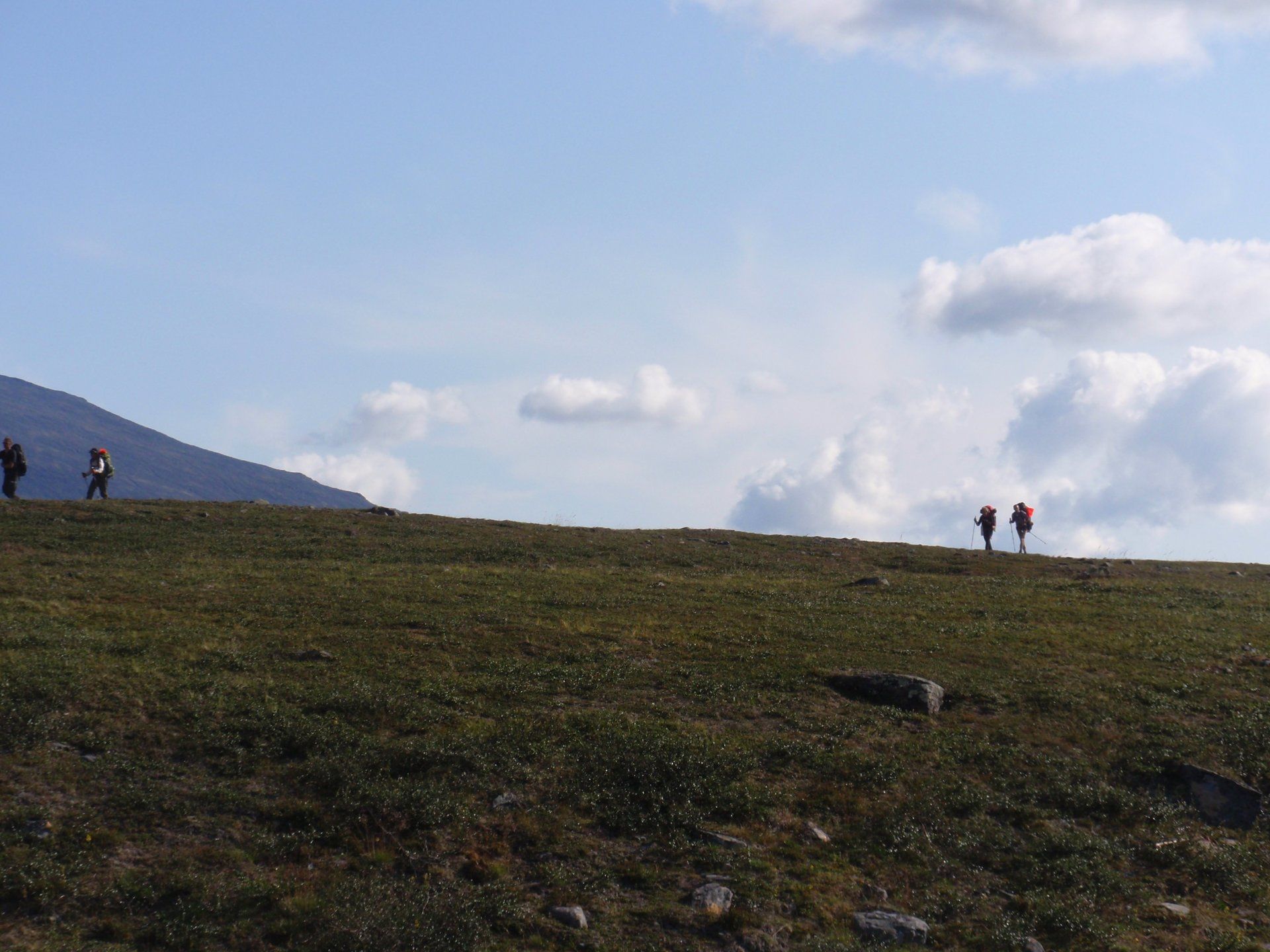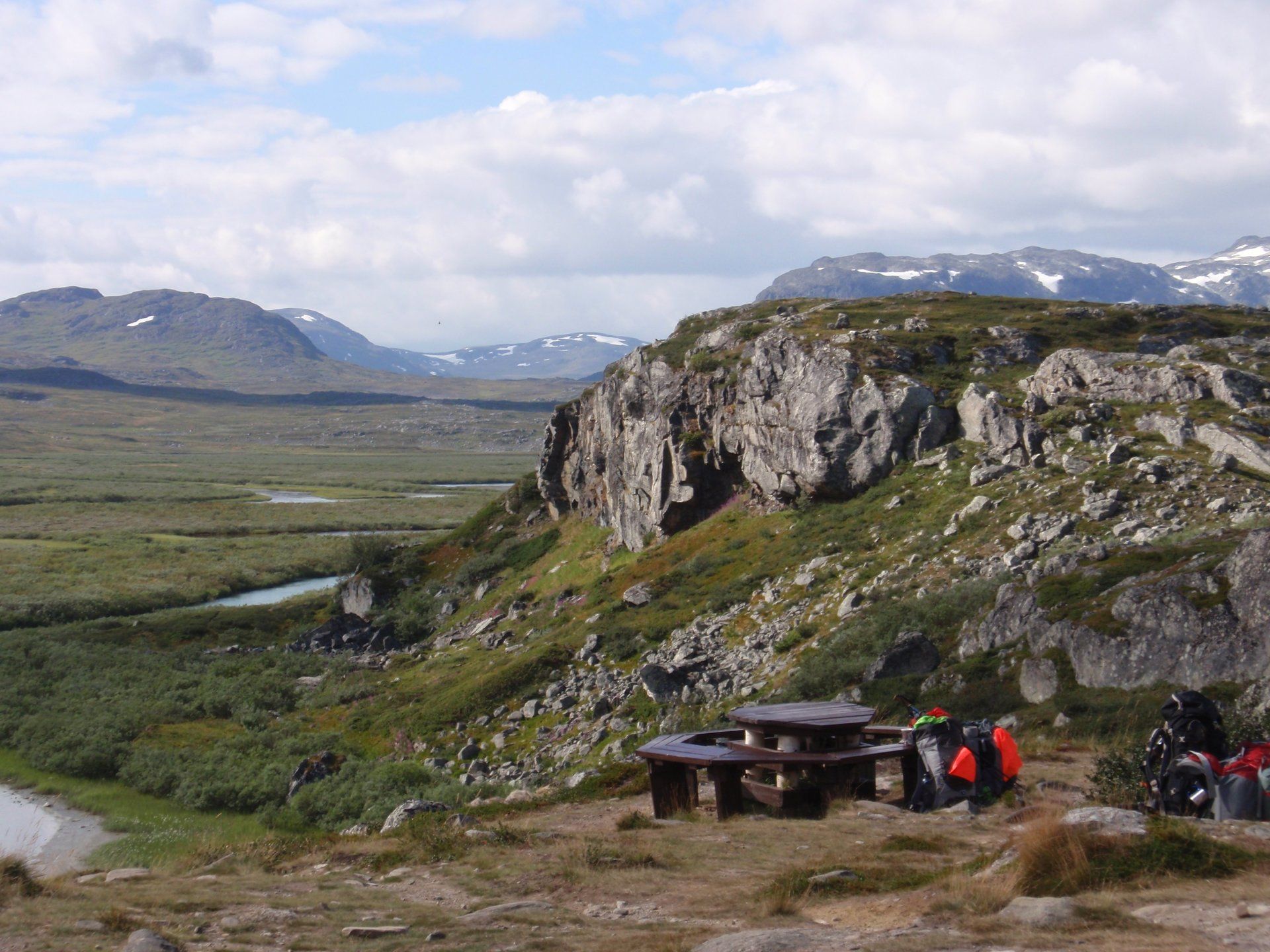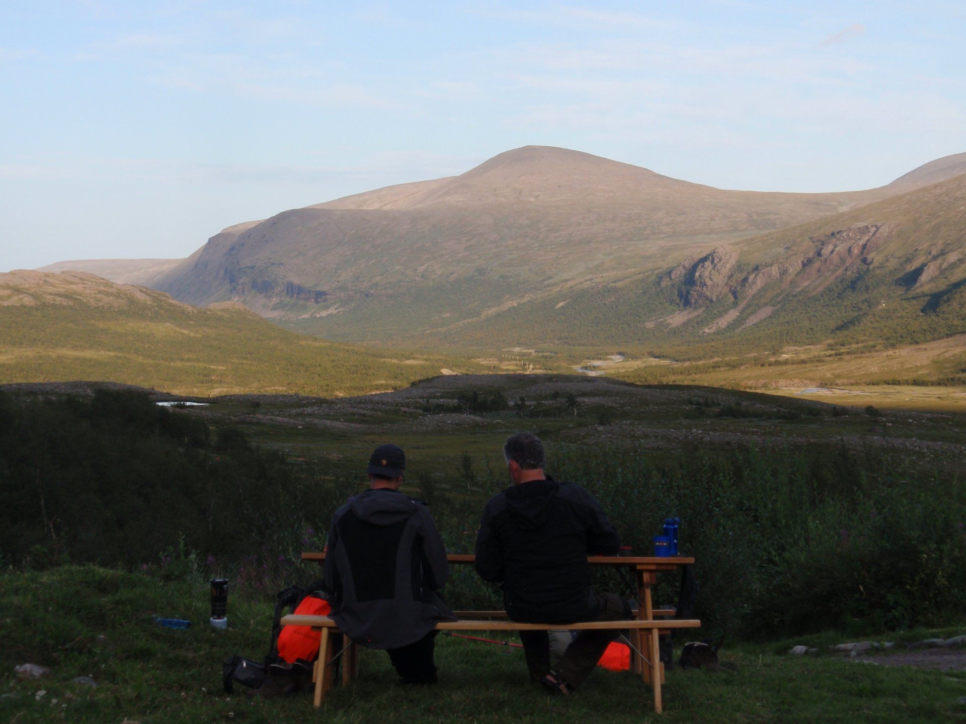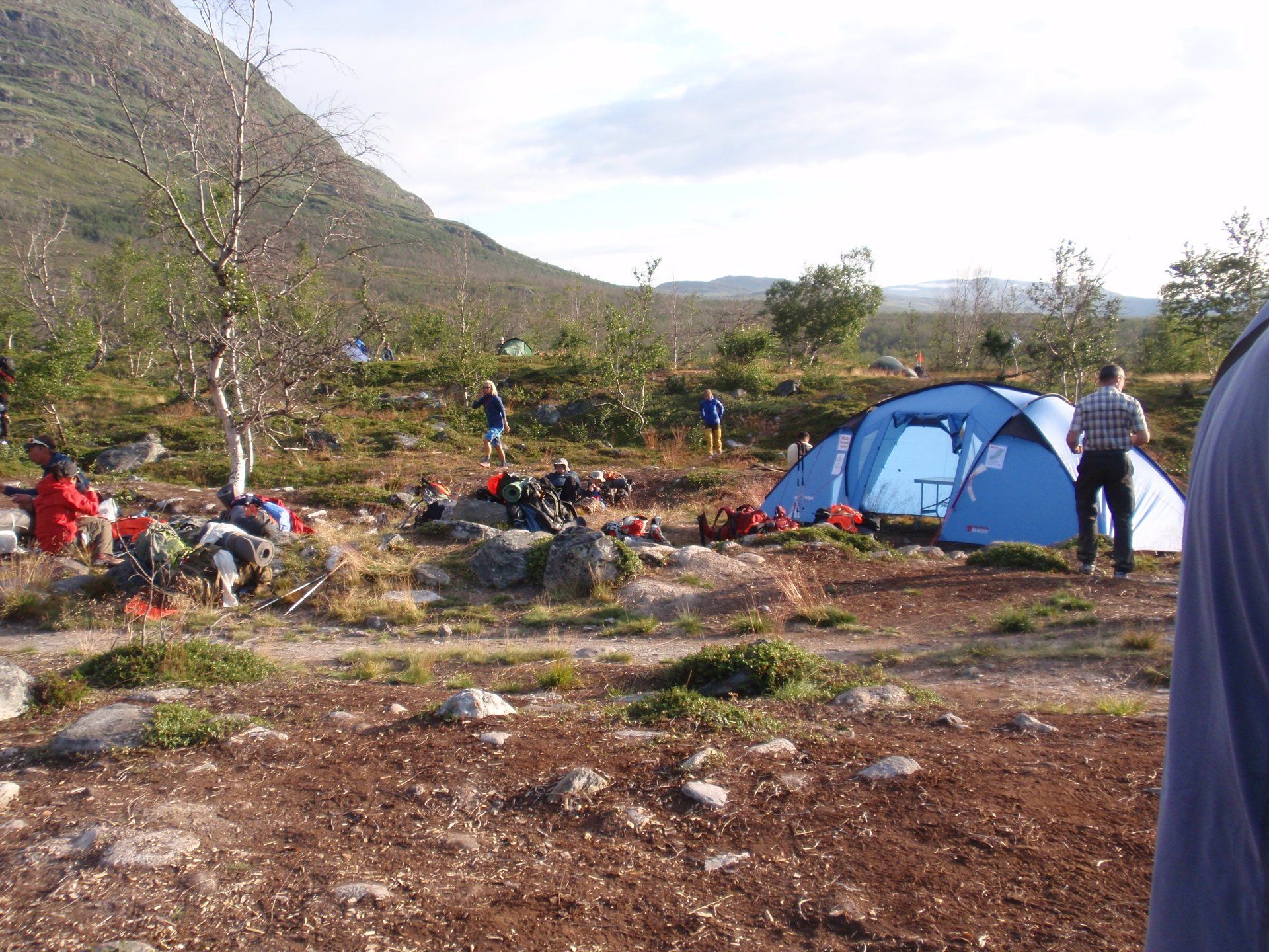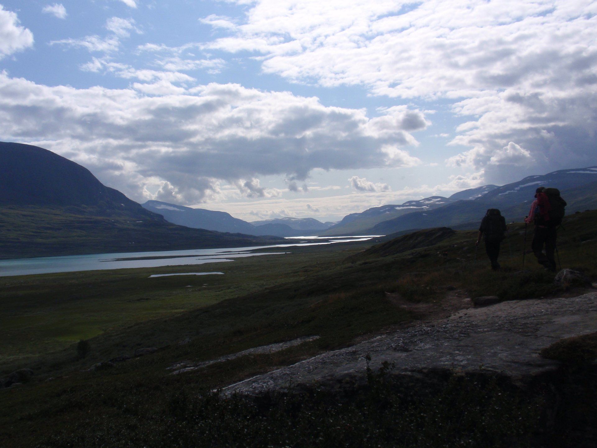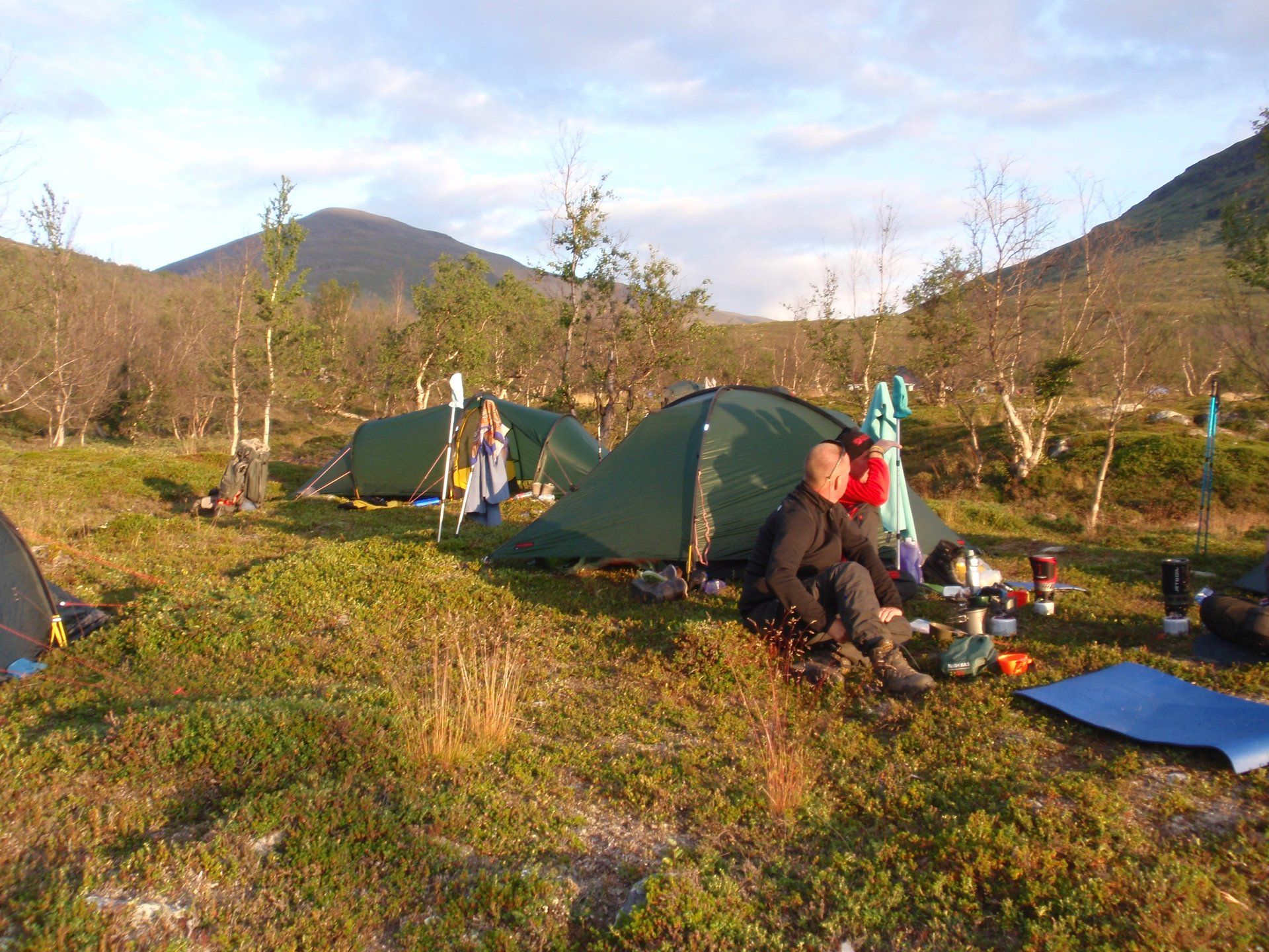 We lopen westelijk, eerst door een berkenbos, waarbij de berken door de noordelijke ligging niet hoger zijn als een meter of 3. Mijn rugzak voelt wat onwennig en mijn voeten doen nu al zeer, maar wat geniet ik van deze overweldigende natuur. Geen wegen, dus geen auto's, alleen maar een lange rij wandelaars met een rugzak op hun rug, met daaraan een oranje tag, zodat je in noodgevallen zichtbaar bent vanuit de lucht. Geen lucht-, licht- of geluid vervuiling, puur natuur! De paden zijn goed begaanbaar en we genieten van de stilte. Na zo'n 6 km komen we bij een prachtig meer, waar zich een 'Lapdonalds' bevindt, waar we een heerlijke wrap met rendiervlees bestellen. Even pauze, de rugzak af en de voetjes even rust geven. Inmiddels is het lint met wandelaars behoorlijk uit elkaar getrokken en krijgen we steeds meer het gevoel dat we alleen op de wereld zijn. Na een half uur hangen we de rugzakken weer om en lopen we verder langs het meer. Na het meer wandelen we langzaam omhoog het berkenbos uit en komen na nog zo'n 12 km in Kebnekaise, onze laatste stop in de nog relatief bewoonde wereld. Hier in het fjällstation (berghut) is nog stromend water en gewone toiletten. Het is inmiddels etenstijd en we besluiten hier onze eerste expeditie maaltijd te maken en na het eten nog een kilometer of 3 door te lopen, alvorens we ons kampement maken. Bizar hoe zo'n expeditie maaltijd na 18,82 km wandelen smaakt. We slaan voldoende water in om de avond en nacht door te komen, hierdoor hoeven we niet perse bij een rivier te kamperen. Inmiddels laten we de boomgrens achter ons en wandelen we door relatief smal dal met links en rechts van ons bergen. Voor ons loopt het kronkelend pad steeds meer omhoog en zien we een lang lint wandelaars met oranje tags aan hun rugzakken. We wandelen door tot een uur of 8 's avonds. Ik ben ieder gevoel voor tijd inmiddels kwijt omdat in deze tijd van het jaar de zon bijna niet meer onder gaat, zo'n 100 km boven de Poolcirkel. Alleen de vermoeidheid in mijn lichaam en de pijn aan mijn voeten maken mij duidelijk dat het genoeg is geweest voor vandaag. gedeeltelijk over het Kungsleden Trail, door een drassig gebied, waardoor gebruik wordt gemaakt van plankenpaden. Een prachtig heuvelachtig gebied met veel bosbessenstruiken en rivieren waar je nog gewoon uit kunt drinken.