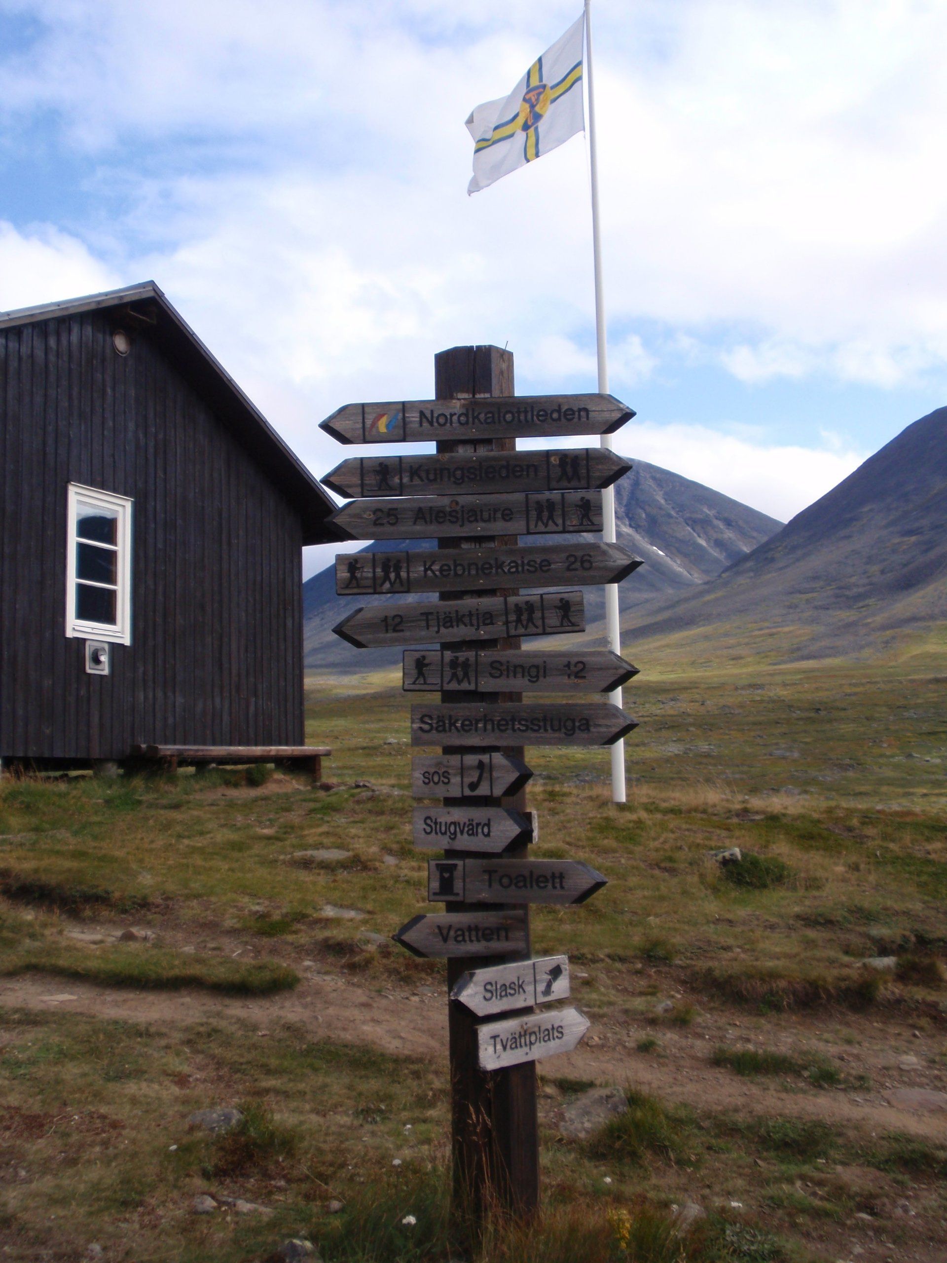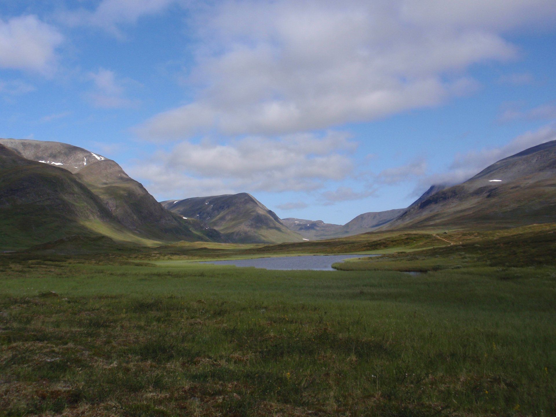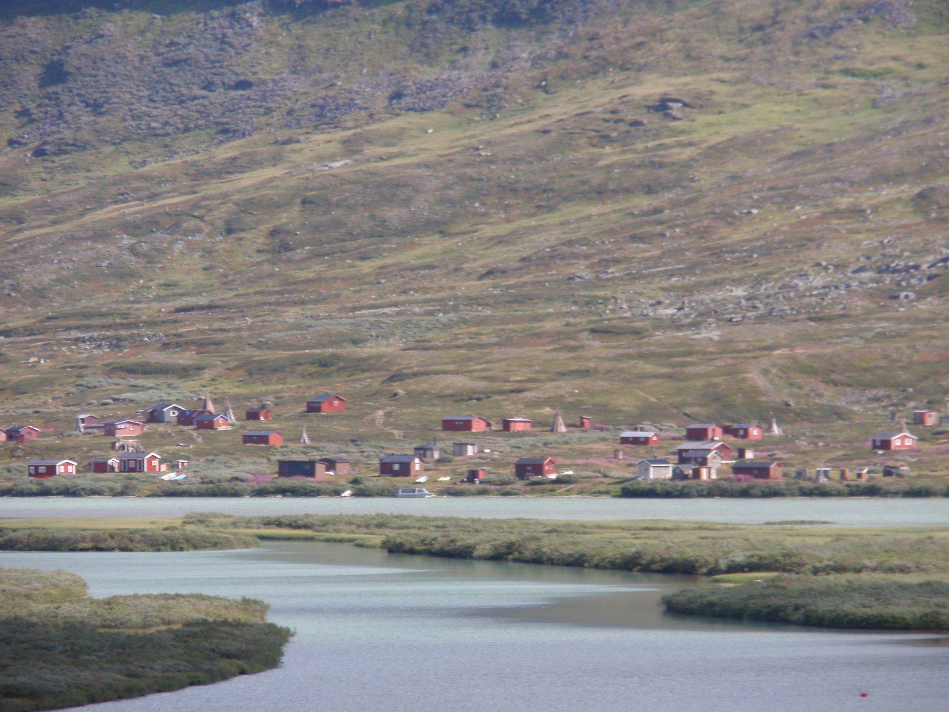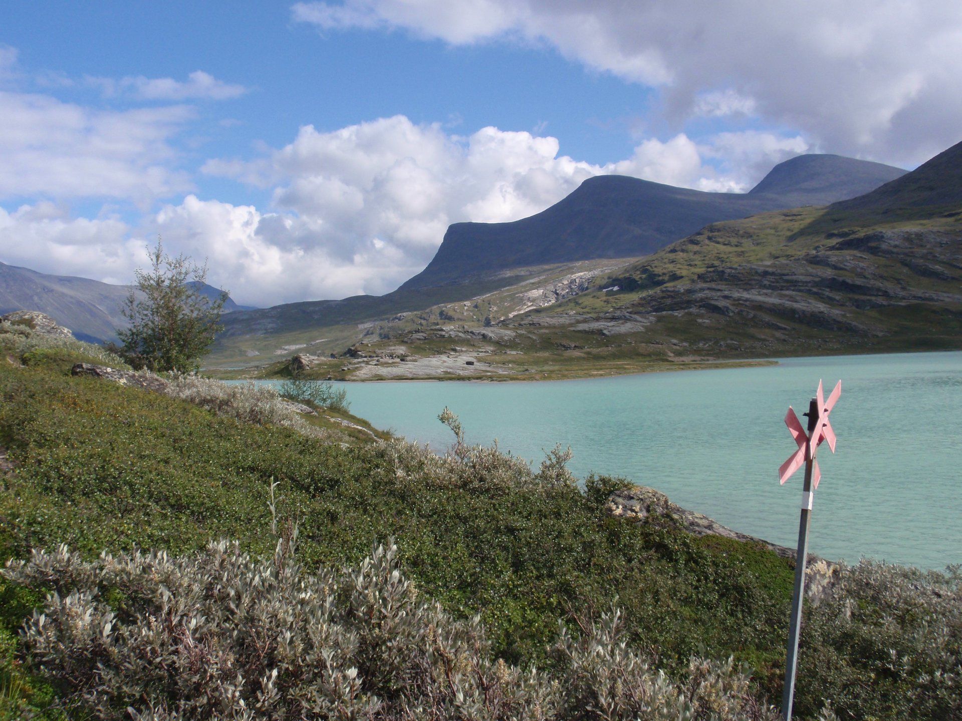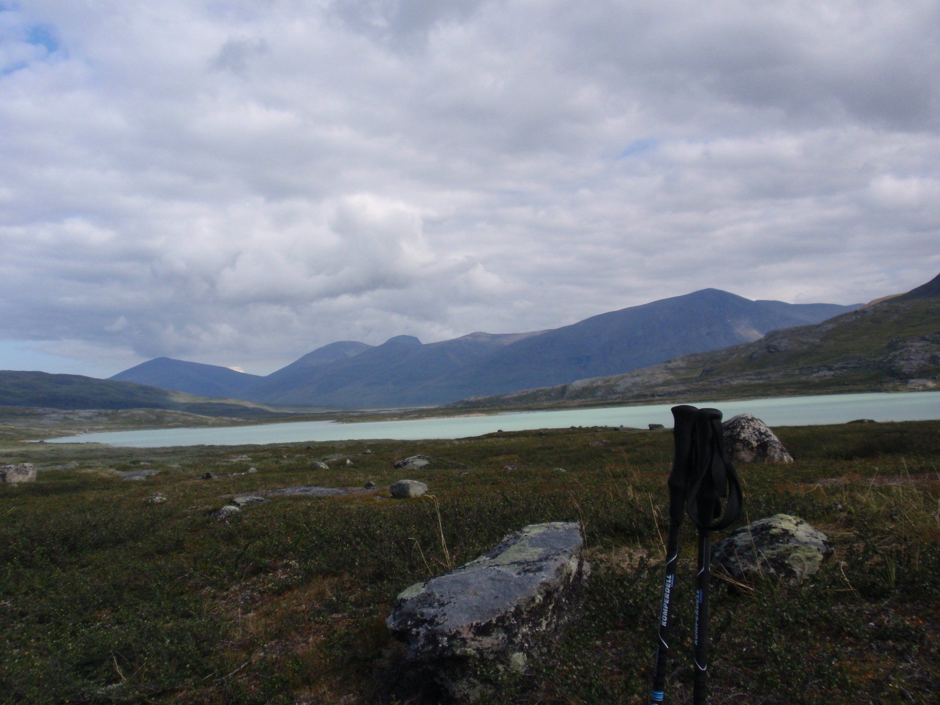 We lopen westelijk, eerst door een berkenbos, waarbij de berken door de noordelijke ligging niet hoger zijn als een meter of 3. Mijn rugzak voelt wat onwennig en mijn voeten doen nu al zeer, maar wat geniet ik van deze overweldigende natuur. Geen wegen, dus geen auto's, alleen maar een lange rij wandelaars met een rugzak op hun rug, met daaraan een oranje tag, zodat je in noodgevallen zichtbaar bent vanuit de lucht. Geen lucht-, licht- of geluid vervuiling, puur natuur! De paden zijn goed begaanbaar en we genieten van de stilte. Na zo'n 6 km komen we bij een prachtig meer, waar zich een 'Lapdonalds' bevindt, waar we een heerlijke wrap met rendiervlees bestellen. Even pauze, de rugzak af en de voetjes even rust geven. Inmiddels is het lint met wandelaars behoorlijk uit elkaar getrokken en krijgen we steeds meer het gevoel dat we alleen op de wereld zijn. Na een half uur hangen we de rugzakken weer om en lopen we verder langs het meer. Na het meer wandelen we langzaam omhoog het berkenbos uit en komen na nog zo'n 12 km in Kebnekaise, onze laatste stop in de nog relatief bewoonde wereld. Hier in het fjällstation (berghut) is nog stromend water en gewone toiletten. Het is inmiddels etenstijd en we besluiten hier onze eerste expeditie maaltijd te maken en na het eten nog een kilometer of 3 door te lopen, alvorens we ons kampement maken. Bizar hoe zo'n expeditie maaltijd na 18,82 km wandelen smaakt. We slaan voldoende water in om de avond en nacht door te komen, hierdoor hoeven we niet perse bij een rivier te kamperen. Inmiddels laten we de boomgrens achter ons en wandelen we door relatief smal dal met links en rechts van ons bergen. Voor ons loopt het kronkelend pad steeds meer omhoog en zien we een lang lint wandelaars met oranje tags aan hun rugzakken. We wandelen door tot een uur of 8 's avonds. Ik ben ieder gevoel voor tijd inmiddels kwijt omdat in deze tijd van het jaar de zon bijna niet meer onder gaat, zo'n 100 km boven de Poolcirkel. Alleen de vermoeidheid in mijn lichaam en de pijn aan mijn voeten maken mij duidelijk dat het genoeg is geweest voor vandaag. gedeeltelijk over het Kungsleden Trail, door een drassig gebied, waardoor gebruik wordt gemaakt van plankenpaden. Een prachtig heuvelachtig gebied met veel bosbessenstruiken en rivieren waar je nog gewoon uit kunt drinken.