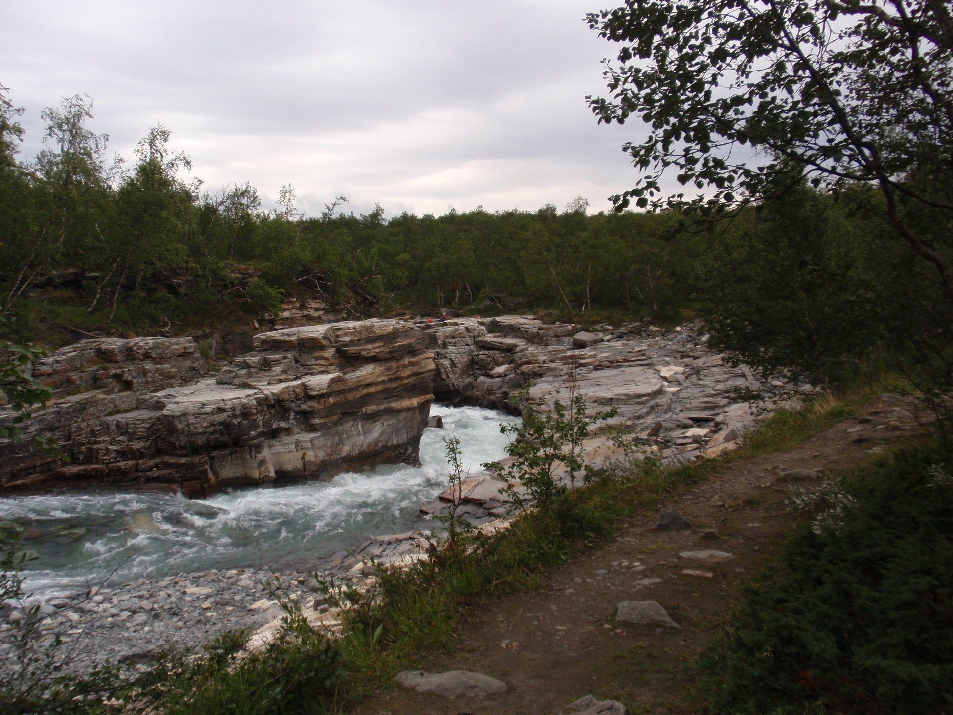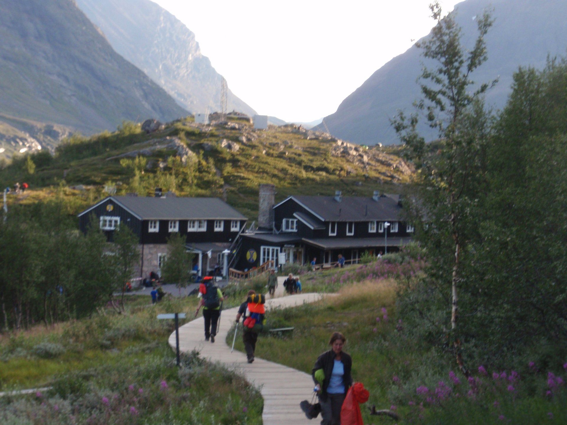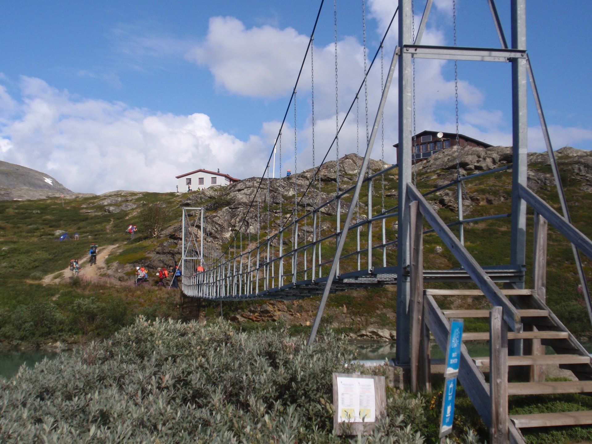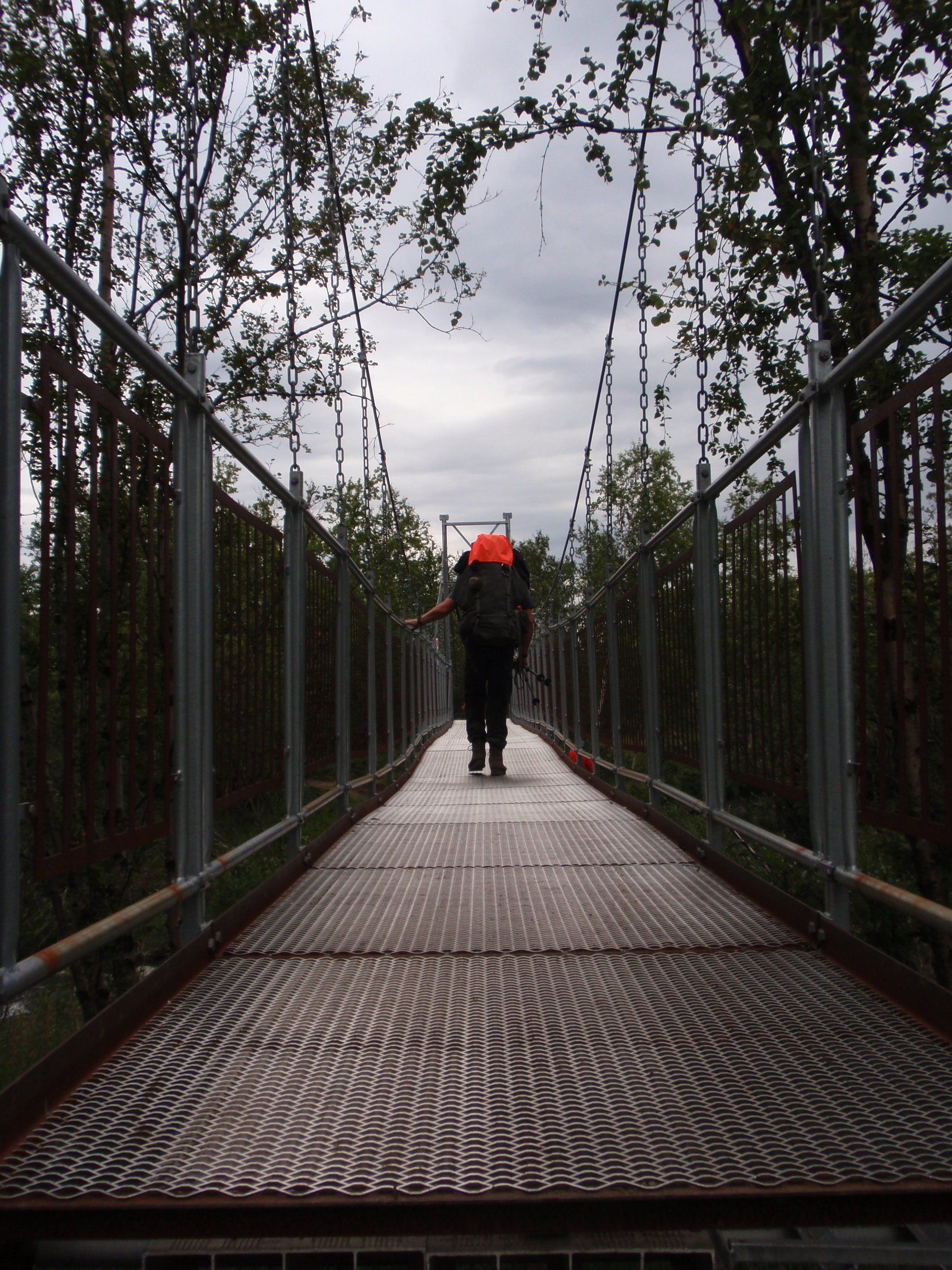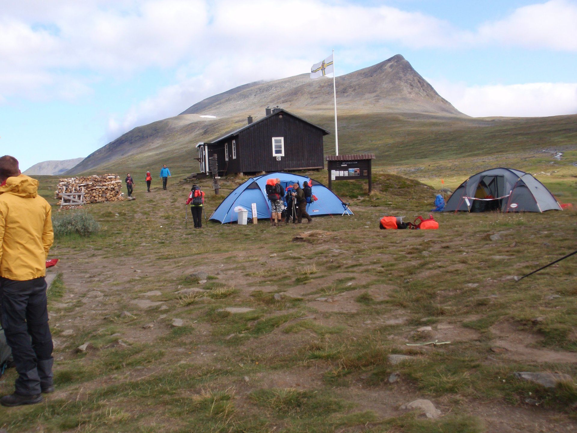 We lopen westelijk, eerst door een berkenbos, waarbij de berken door de noordelijke ligging niet hoger zijn als een meter of 3. Mijn rugzak voelt wat onwennig en mijn voeten doen nu al zeer, maar wat geniet ik van deze overweldigende natuur. Geen wegen, dus geen auto's, alleen maar een lange rij wandelaars met een rugzak op hun rug, met daaraan een oranje tag, zodat je in noodgevallen zichtbaar bent vanuit de lucht. Geen lucht-, licht- of geluid vervuiling, puur natuur! De paden zijn goed begaanbaar en we genieten van de stilte. Na zo'n 6 km komen we bij een prachtig meer, waar zich een 'Lapdonalds' bevindt, waar we een heerlijke wrap met rendiervlees bestellen. Even pauze, de rugzak af en de voetjes even rust geven. Inmiddels is het lint met wandelaars behoorlijk uit elkaar getrokken en krijgen we steeds meer het gevoel dat we alleen op de wereld zijn. Na een half uur hangen we de rugzakken weer om en lopen we verder langs het meer. Na het meer wandelen we langzaam omhoog het berkenbos uit en komen na nog zo'n 12 km in Kebnekaise, onze laatste stop in de nog relatief bewoonde wereld. Hier in het fjällstation (berghut) is nog stromend water en gewone toiletten. Het is inmiddels etenstijd en we besluiten hier onze eerste expeditie maaltijd te maken en na het eten nog een kilometer of 3 door te lopen, alvorens we ons kampement maken. Bizar hoe zo'n expeditie maaltijd na 18,82 km wandelen smaakt. We slaan voldoende water in om de avond en nacht door te komen, hierdoor hoeven we niet perse bij een rivier te kamperen. Inmiddels laten we de boomgrens achter ons en wandelen we door relatief smal dal met links en rechts van ons bergen. Voor ons loopt het kronkelend pad steeds meer omhoog en zien we een lang lint wandelaars met oranje tags aan hun rugzakken. We wandelen door tot een uur of 8 's avonds. Ik ben ieder gevoel voor tijd inmiddels kwijt omdat in deze tijd van het jaar de zon bijna niet meer onder gaat, zo'n 100 km boven de Poolcirkel. Alleen de vermoeidheid in mijn lichaam en de pijn aan mijn voeten maken mij duidelijk dat het genoeg is geweest voor vandaag. gedeeltelijk over het Kungsleden Trail, door een drassig gebied, waardoor gebruik wordt gemaakt van plankenpaden. Een prachtig heuvelachtig gebied met veel bosbessenstruiken en rivieren waar je nog gewoon uit kunt drinken.