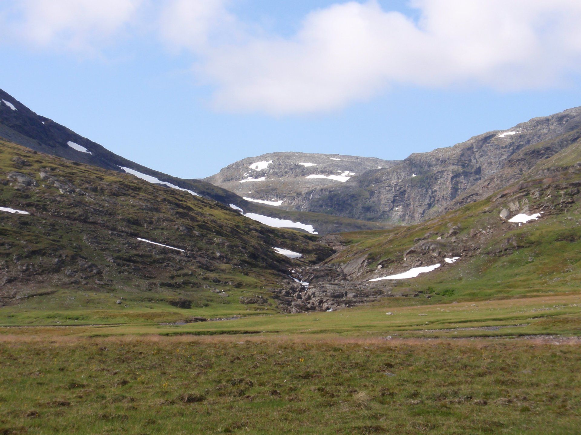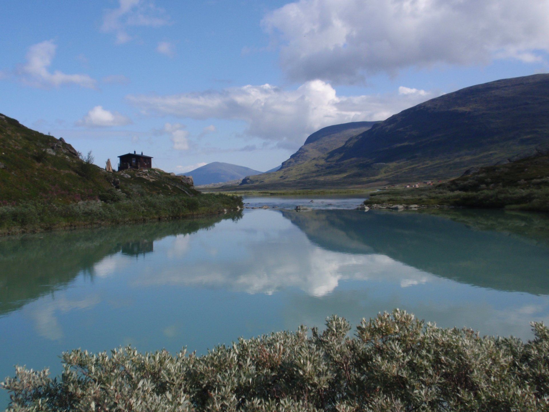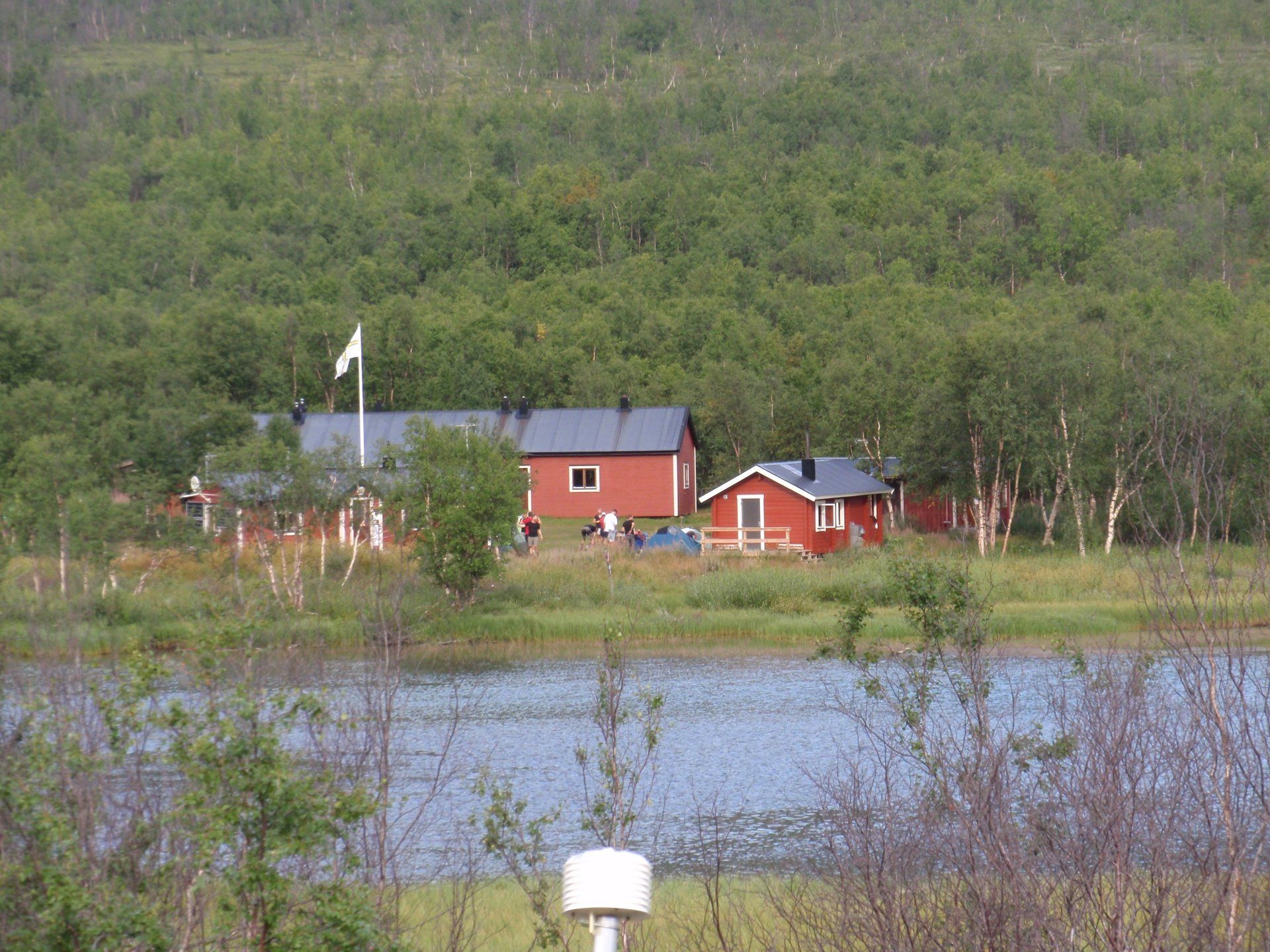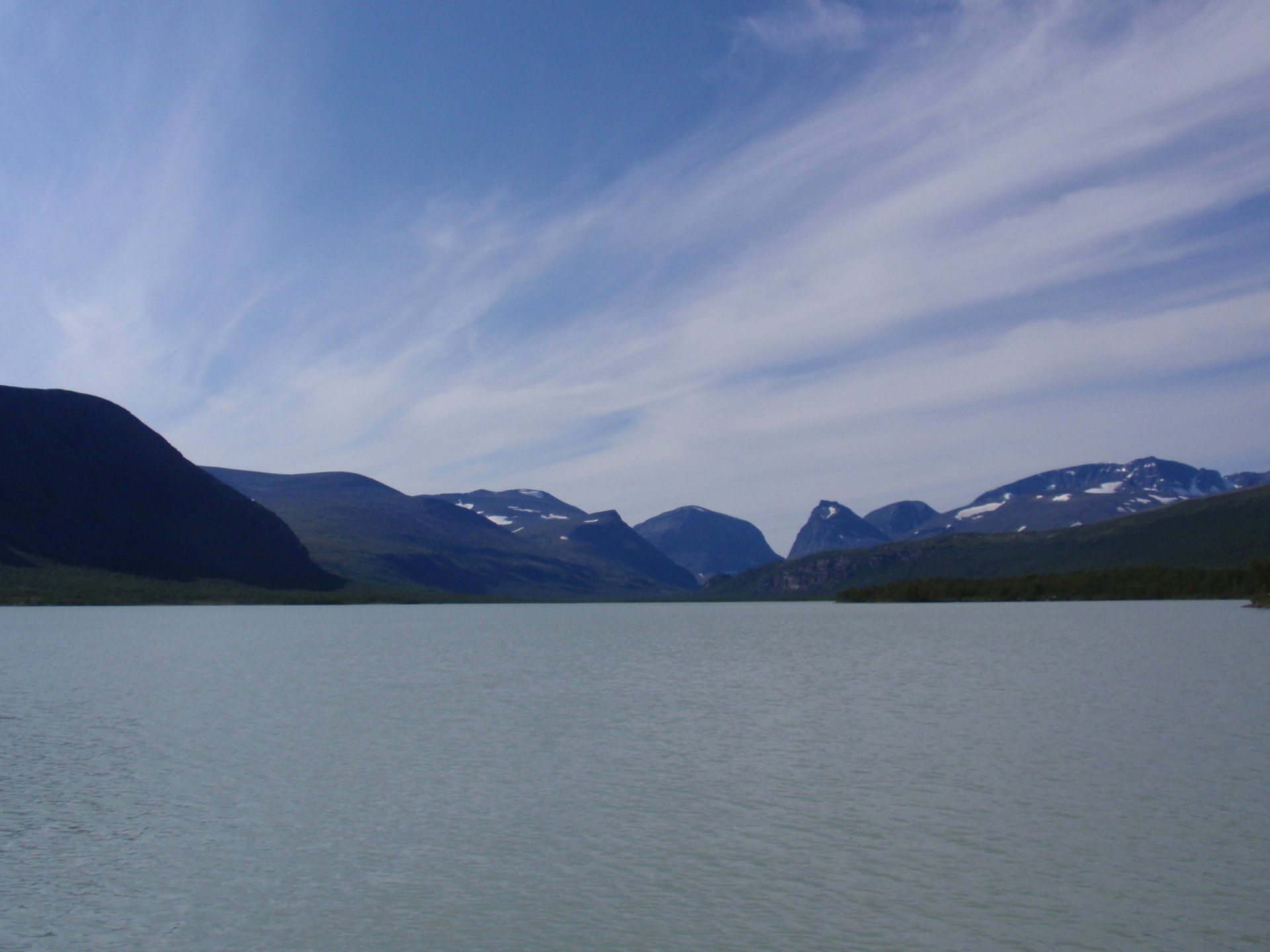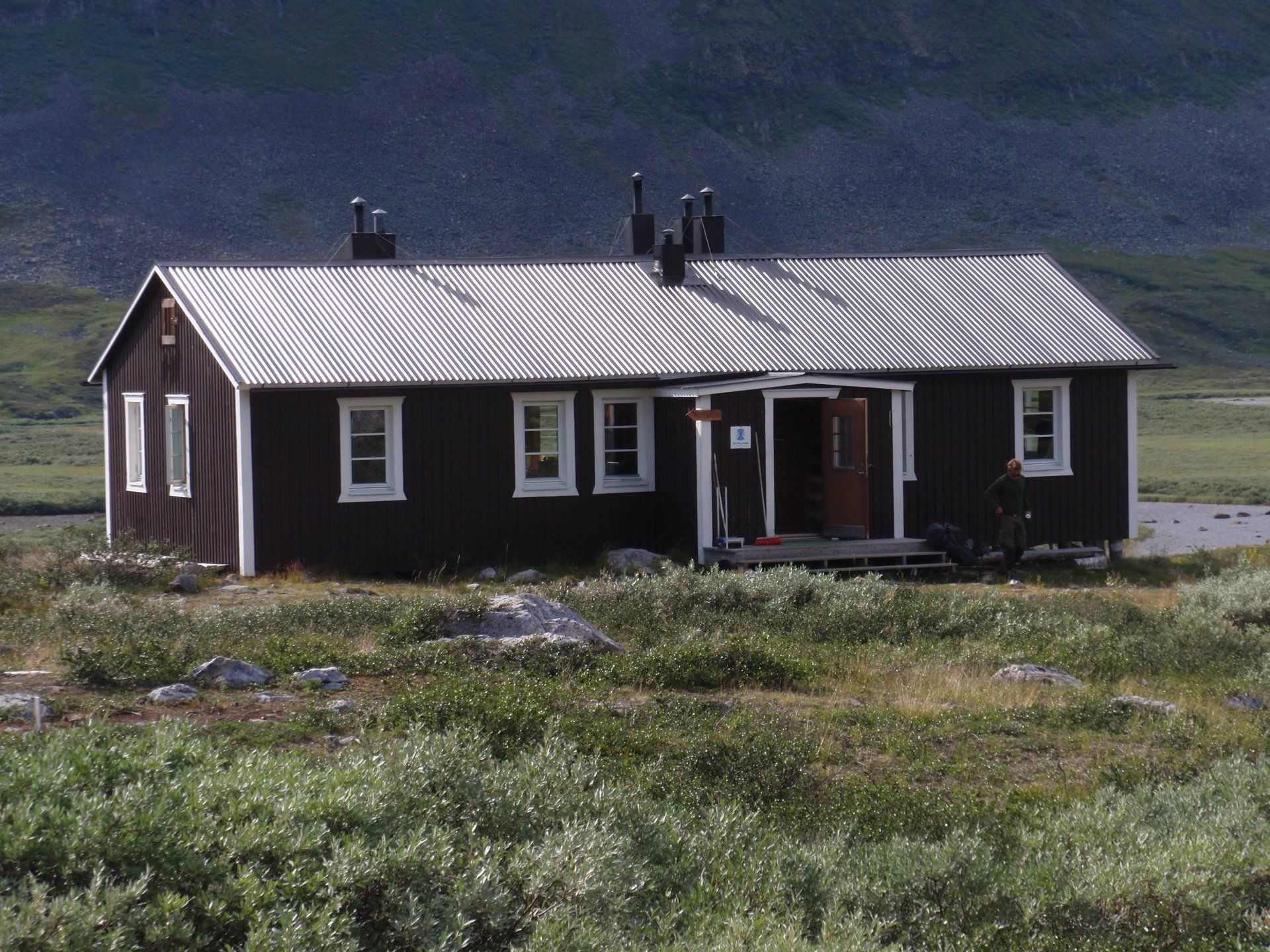 We lopen westelijk, eerst door een berkenbos, waarbij de berken door de noordelijke ligging niet hoger zijn als een meter of 3. Mijn rugzak voelt wat onwennig en mijn voeten doen nu al zeer, maar wat geniet ik van deze overweldigende natuur. Geen wegen, dus geen auto's, alleen maar een lange rij wandelaars met een rugzak op hun rug, met daaraan een oranje tag, zodat je in noodgevallen zichtbaar bent vanuit de lucht. Geen lucht-, licht- of geluid vervuiling, puur natuur! De paden zijn goed begaanbaar en we genieten van de stilte. Na zo'n 6 km komen we bij een prachtig meer, waar zich een 'Lapdonalds' bevindt, waar we een heerlijke wrap met rendiervlees bestellen. Even pauze, de rugzak af en de voetjes even rust geven. Inmiddels is het lint met wandelaars behoorlijk uit elkaar getrokken en krijgen we steeds meer het gevoel dat we alleen op de wereld zijn. Na een half uur hangen we de rugzakken weer om en lopen we verder langs het meer. Na het meer wandelen we langzaam omhoog het berkenbos uit en komen na nog zo'n 12 km in Kebnekaise, onze laatste stop in de nog relatief bewoonde wereld. Hier in het fjällstation (berghut) is nog stromend water en gewone toiletten. Het is inmiddels etenstijd en we besluiten hier onze eerste expeditie maaltijd te maken en na het eten nog een kilometer of 3 door te lopen, alvorens we ons kampement maken. Bizar hoe zo'n expeditie maaltijd na 18,82 km wandelen smaakt. We slaan voldoende water in om de avond en nacht door te komen, hierdoor hoeven we niet perse bij een rivier te kamperen. Inmiddels laten we de boomgrens achter ons en wandelen we door relatief smal dal met links en rechts van ons bergen. Voor ons loopt het kronkelend pad steeds meer omhoog en zien we een lang lint wandelaars met oranje tags aan hun rugzakken. We wandelen door tot een uur of 8 's avonds. Ik ben ieder gevoel voor tijd inmiddels kwijt omdat in deze tijd van het jaar de zon bijna niet meer onder gaat, zo'n 100 km boven de Poolcirkel. Alleen de vermoeidheid in mijn lichaam en de pijn aan mijn voeten maken mij duidelijk dat het genoeg is geweest voor vandaag. gedeeltelijk over het Kungsleden Trail, door een drassig gebied, waardoor gebruik wordt gemaakt van plankenpaden. Een prachtig heuvelachtig gebied met veel bosbessenstruiken en rivieren waar je nog gewoon uit kunt drinken.